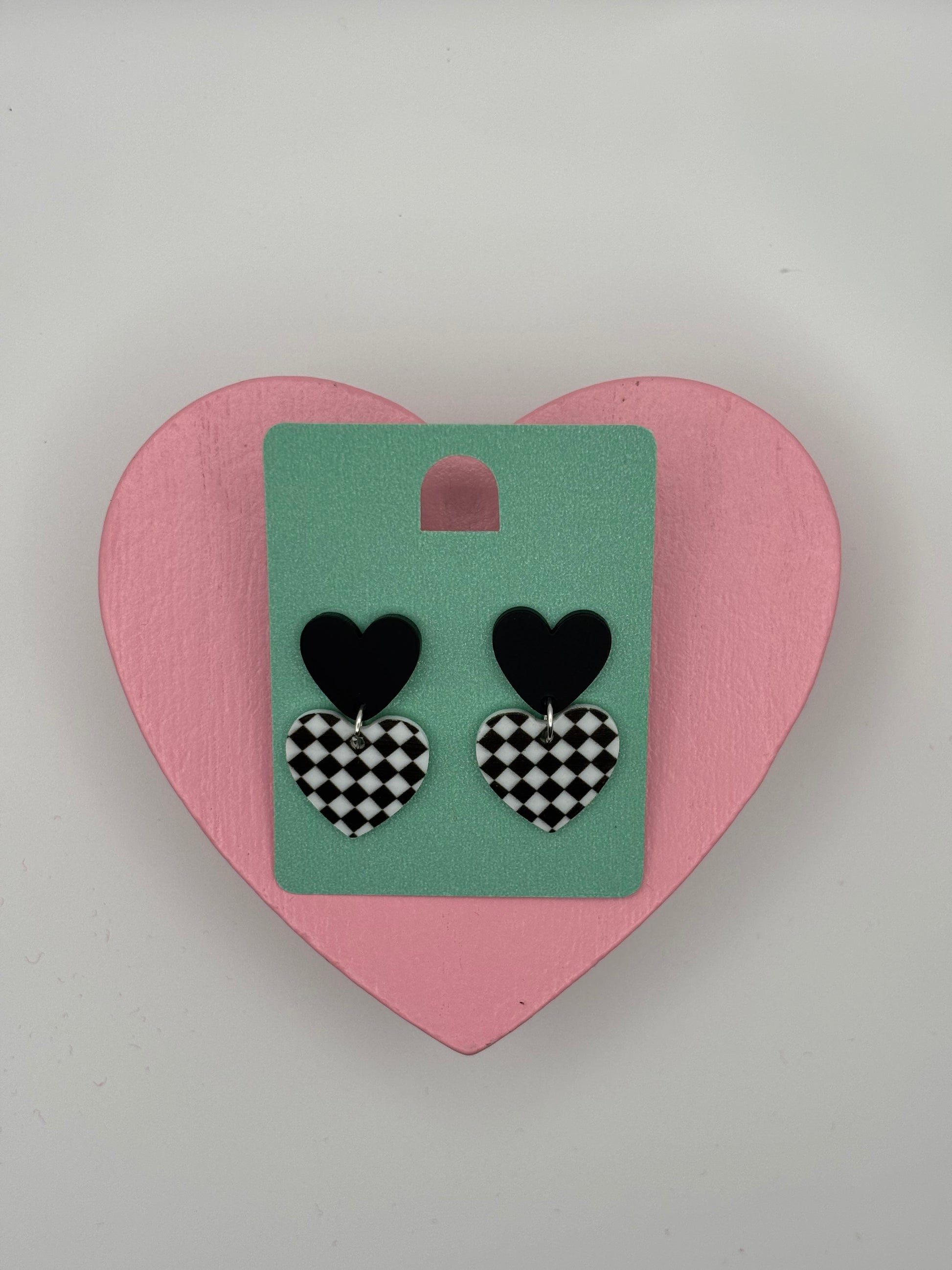 These earrings are made with black heart earring studs and acrylic checkered heart charms.