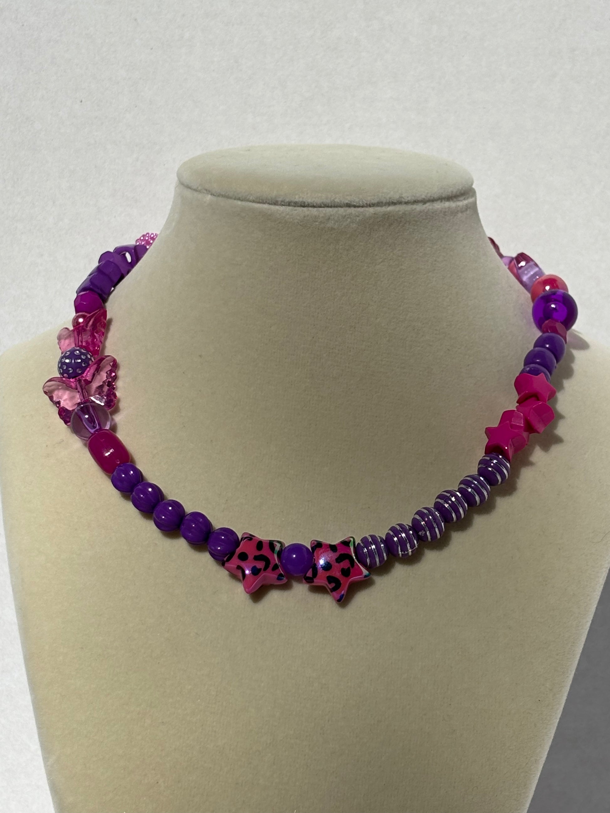 Made with plastic and acrylic beads with silver chain & silver lobster clasp