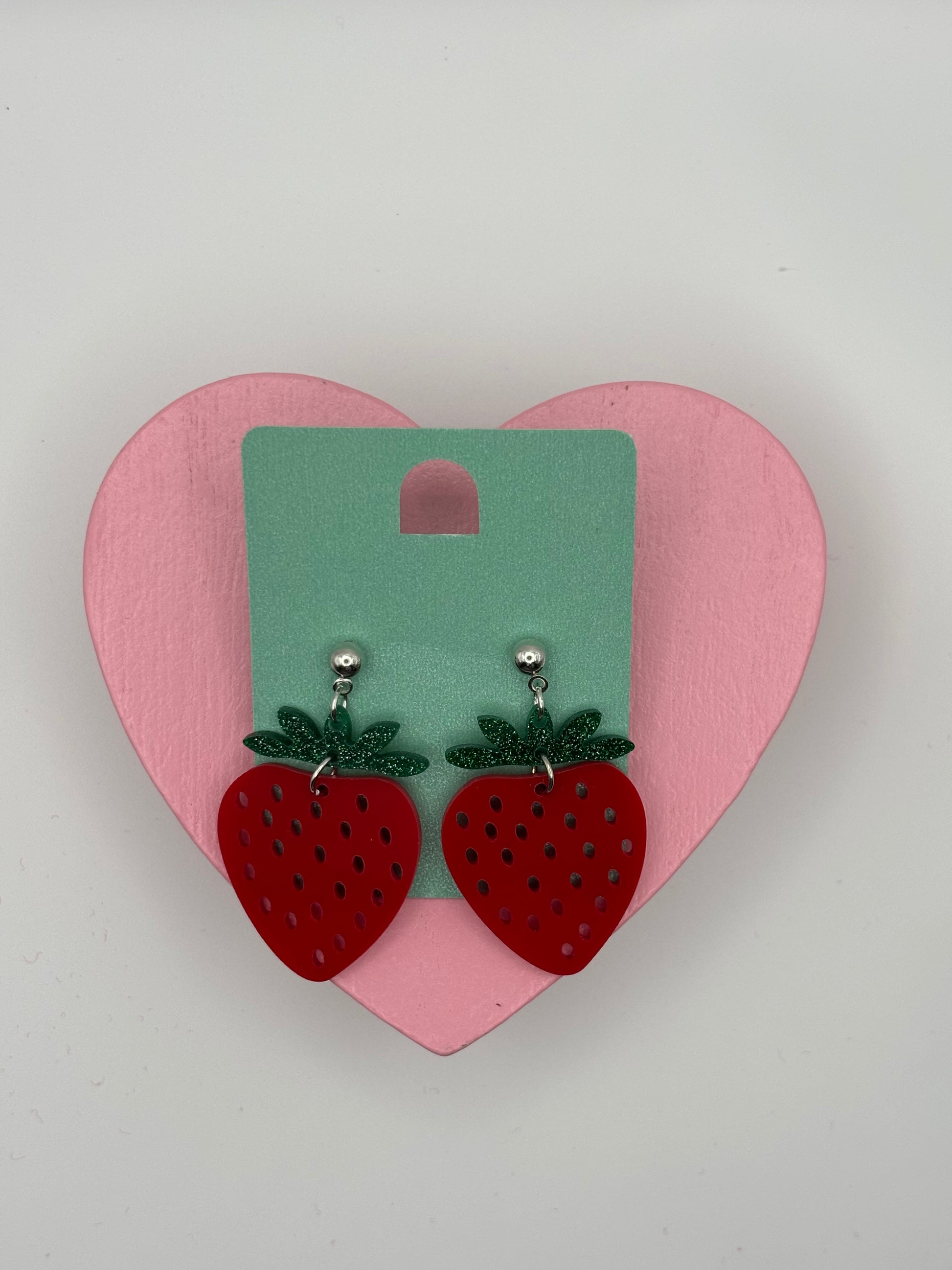 These earrings are made with silver findings and acrylic leaf & strawberry charms.